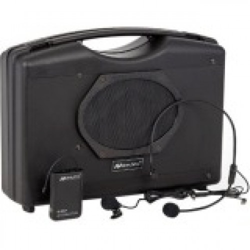 Bluetooth® Audio Portable BuddyA complete presentation system built into a rugged, compact carrying case. Powerful 50 Watt multimedia stereo amp, reach up to 1,000 people outdoors or in rooms up to 10,000 square feet. Bluetooth wireless technology, stream audio wirelessly from your smart phone, tablet, or any other Bluetooth® enabled device. A proven "Road Warrior", specially tooled and molded plastic briefcase-style enclosure for exceptional durability and portability. Travels and sets up so easily. Dual wireless option, accomodate multiple presenters. By adding a second Wireless Mic Kit (sold separately) two presenters can be wireless simultaneously with the freedom to roam within a 300 ft. radius. Powered by 10 D-cell batteries for up to 200 hours of talk time or choose optional rechargeable NiCad battery pack (requires S1460).