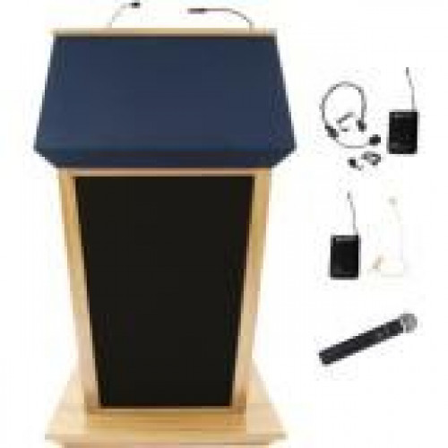 SW3045 Patriot Plus Lectern, 50-Watt SW805A Multimedia Stereo Amplifier, Built-in Wireless 16 Channel UHF Receiver, Choice of Wireless Mic: Lapel & Headset, Flesh Tone Over-ear, or Handheld Microphone, 4 x Built-in 6" x 8" Oval Speaker, Hot Gooseneck Dynamic Mic