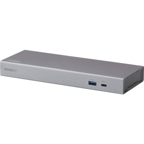The UH7230 Thunderbolt 3 Multiport Dock connects a laptop to Ethernet, DisplayPort, USB-C 3.1 Gen 1, speaker and microphone ports through a single cable. The all-in-one dock provides a total of 8 ports and is designed to instantly connect and disconnect from your Thunderbolt 3 laptop. The UH7230 supports a single Thunderbolt monitor with resolution up to 5K (5120 x 2880 @ 60Hz), and dual 4K (4096 x 2160 @ 60Hz) multi-display setups on a DisplayPort and a Thunderbolt or a USB-C displays. Gigabit Ethernet port delivers Internet speeds up to one Gigabit (1000 Mbps). This multiport dock also supports USB Power Delivery 2.0, which means the UH7230 can provide power to matched USB-C Windows or Mac laptops with PD Profile specifications of 20V/4.25A, 15V/3A, 9V/3A and 5V/3A. The ATEN Thunderbolt™ 3 Multiport Dock is designed for creating a simplified and productive state-of-the-art workspace. With included Thunderbolt™ cable, it delivers more connectivity to your MacBook Pro or Windows laptop and more charging capability than ever before. Harness the full potential of Thunderbolt™ 3 and embrace the next generation of workstation connectivity. It is ideal for creative professionals and those who work with high-resolution, and graphic-intensive images, video, and CAD drawings, such as video producers, graphicand web designers, architects, and more.Dual 4K or 5K Resolution for Graphics-intensive Multitasking Combining a truly immersive next-generation visual experience with amazing throughput speeds, the UH7230 multiport dock allows you to connect two 4K displays (one DisplayPort and one Thunderbolt™ 3 USB-C port) or one latest generation 5K display, with nearly 16 million more pixels than an HDTV. Enjoy the astonishing resolution, contrast and color depth, whether you are editing videos or digital media, designing graphics or using any application that requires high-definition visuals. Blazing Fast Speed to Boost Productivity With Thunderbolt™ 3´s phenomenal bandwidth, up to 40Gbps, transferring a 4K movie needs less than 30 seconds. This means you can transfer files faster, reduce waiting and accomplish more in the same amount of time. Up to 85W Power Delivery for Mac or Windows Laptop UH7230 is an intuitive central hub for not only connectivity expansion but also for charging your laptop and USB accessories. It supports up to 85W of power delivery for Mac or Windows laptops. Single Cable for Astounding Expandability Using the single Thunderbolt™ 3 cable (included), the docking station expands the connectivity up to 8 ports, including audio, Gigabit Ethernet, DisplayPort, Thunderbolt™ 3 USB-C and USB 3.1 Gen 1 ports to accommodate your most demanding computing needs. A Thunderbolt™ 3 port is also provided to daisy chain up to 5 additional Thunderbolt™ 3 devices, such as data storage. Supports both Thunderbolt 3 (40Gbps) and USB 3.1 Gen2 (10Gbps) protocol through a single Thunderbolt 3 cable Connect up to 8 devices to a laptop via a single Thunderbolt 3 cable / can daisy-chain 5 additional Thunderbolt devices Supports 5K resolution on a single Thunderbolt 3 display or dual 4K resolution on one DisplayPort display and one USB-C / Thunderbolt 3 display 85W Universal Power Delivery for charging a Thunderbolt 3 laptop or Macbookpro ; supports 20V/4.25A, 15V/3A, 9V/3A and 5V/3A power specifiation for the output power Compatible with legacy Thunderbolt devices via adapter Gigabit Ethernet port Audio line-in and line-out OS Support: Windows 10 32/64 bit, and OS X Sierra 10.12 later