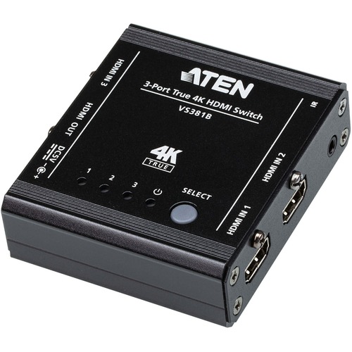 The VS381B 3-Port True 4K HDMI Switch with Auto Switching provides you to switch 3 HDMI input sources to an HDMI display. It supports video resolutions up to True 4K (4096 x 2160 @ 60Hz 4:4:4), data rates up to 18 Gbps, HDR, 3D, Deep Color, and HD lossless audio formats. Furthermore, the VS381B offers switching methods between HDMI sources by front panel pushbuttons and IR remote control, enabling users to effortlessly select desired input. Featuring above functionalities provides you a practical solution for auditorium, home theater, meeting rooms, trade shows, shopping centers, and more.