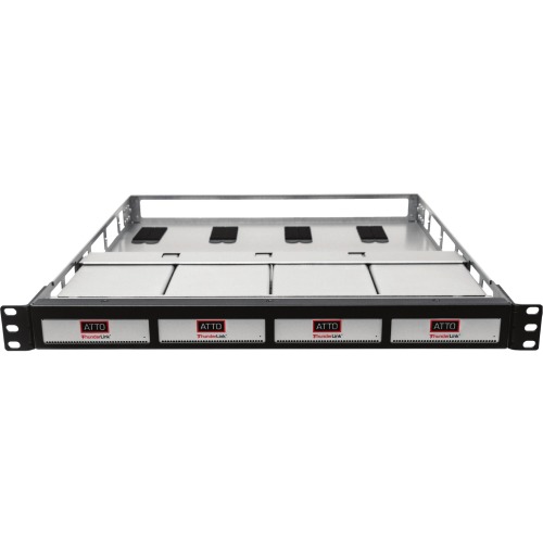 Looking for a way to rack and organize Thunderbolt™ ThunderLink Adapters? ThunderRack 1U shelf gives you the ability to easily rack Thunderlink units, whether on-set or in a standard rack in the data center. Now you can seamlessly integrate ThunderLink adapters into your existing workspace and keep units safe and secure all while freeing up desktop space. Fits up to four ATTO ThunderLink Adapters Slim 1U form-factor Fits traditional 19" rack environment Rack 21" depth , extend 32" with included L-Bracket or optional rail kit Note: Cabinet depth must be 26" or higher to use rail kit Easily manage power supplies Simple access to single-sided Thunderbolt and protocol ports Designed for optimal airflow Operating temperature recommendation is 0 - 30C for all models