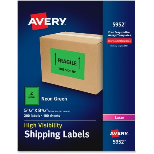 Avery ® High-Visibility Neon Green Shipping Labels for Laser Printers 5-1/2 x 8-1/2, Pack of 200 (5952) - Permanent Adhesive - 8 1/2" Width x 5 1/2" Length - Rectangle - Laser - Neon Green - Paper - 2 / Sheet - 200 / Box - TAA Compliance
