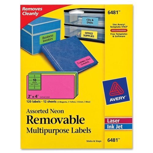 Multipurpose labels feature removable adhesive and neon colors. The labels adhere to smooth surfaces including paper, cardboard, plastic, glass and metal. Rectangular labels stick and stay, but remove cleanly, leaving no residue behind. Vibrant colors on each label make your message stand out. Assorted neon colors include pink, green and yellow. Multipurpose labels are compatible with laser and inkjet printers. Avery offers many easy-to-use templates for Microsoft Word and other popular software programs.