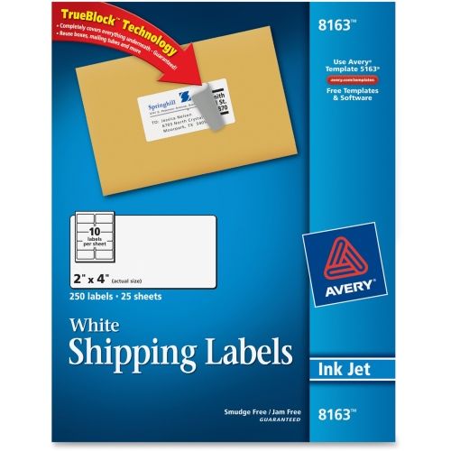 Avery White Shipping Labels with TrueBlock Technology for Inkjet Printers, 2" x 4" (10 Labels/Sheet) (25 Sheets/Pkg). These White Shipping Labels with TrueBlock Technology make deliveries easy no matter what you're sending. These bright white labels completely block out any writing underneath so your boxes and envelopes have a neat and professional appearance every time.