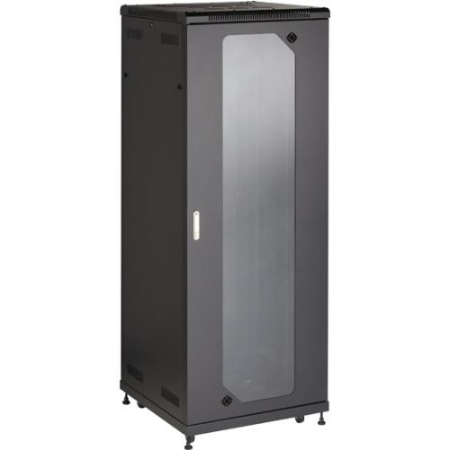 Quick FactsWeight capacity of 2200 pounds.Plexiglass front door for visibility.Constructed of 16-gauge steel.Guaranteed for life!Further DetailsUL® Listed.Lockable, removable vented side panels.Locking, removable front and rear doors.Cabinet baying is easy with the optional Multicabinet Joining Kit (RM2407).Offers versatile mounting with standard 19" M6 rails that work with most Black Box cabinet accessories.Two sets of adjustable rails provide even more versatility.Generous cable access.Arrives fully assembled.
