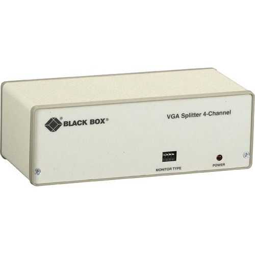 Quick setup. Just plug in your monitors and snap a few DIP switches. The 300-MHz bandwidth gives you sharp images at any resolution: VGA, SGA, and XGA. Kit includes three 10-foot (3-m) VGA output cables and one 6-foot (1.8-m) VGA input cable. Sharp images. Long-distance video distribution. The versatility to handle a variety of applications, in any kind of environment. These qualities - and more - have made the Black Box® VGA Video Splitter an industry favorite.A single splitter enables you to transmit displays from your CPU to up to four monitors 250 feet (76.2 m) away. And if you cascade multiple splitters, you can transmit to as many monitors as necessary. What''s more, the 300-MHz bandwidth provides clear images at any resolution - VGA, SVGA, and XGA®.Setup is simple. Just connect the cables from all monitors to a splitter and flip a few DIP switches. That''s all it takes to project what''s on your PC''s screen to multiple monitors.Typical applications.The uses for a VGA Video Splitter are practically limitless, but some applications are especially popular: On a factory floor where it''s unsafe for CPUs, but your workers need the information to do their jobs - with a splitter, you can distribute information to workstations on the floor while maintaining CPUs in separate rooms. In brokerage firms, stock exchanges, and day trader offices - one video splitter enables you to run real-time ticker crawls across multiple monitors while another splitter puts up-to-the-moment business news on other monitors. Anywhere you have closed-circuit TV (CCTV) feeds - splitters are perfect for CCTV monitoring in corporate buildings, department stores, hotels, entertainment venues, and stadiums. Education and training - a splitter enables you to do more with video in classrooms or for business training and presentations. Industry shows - create multiple attention-grabbing video kiosks or walls of video with a splitter connecting multiple VGA screens. Digital signage - make use of VGA monitors to create video signage that enhances external and internal communications.