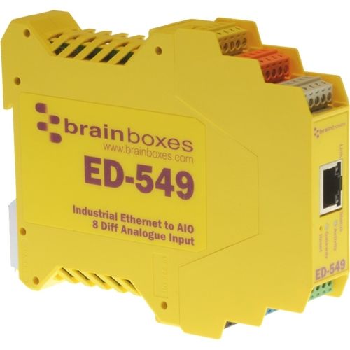 Ideal for all kinds of industry standard sensors and transducers. The ED-549 has 8 Analogue Inputs + RS485 Gateway. It is suitable for high-precision measurements of voltages and currents.Most parameters in the real world are measured using sensors with analogue outputs sensors and Brainboxes ED-549 takes these real world signals and turns them into data on your network. As well as the popular 0-10V and 4-20mA input devices, there is now a Programmable Gain Amplifier (PGA) allowing full scale signals as small as ±75mV to be resolved to 12 bit accuracy across 8 analogue inputs. Each channel is individually configurable for voltage or current input with its own programmable gain. Brainboxes supply a suite of APIs and sample code to communicate with the device using Microsoft .NET framework Visual Basic, C#, C++, Java, Javascript, PHP and more. The device and be configured and secured from a web browser. The device can be installed as a COM Port on a Windows PC to give complete backwards compatibility essential for legacy applications. The ED product range is designed for harsh environments. Typical applications are control and switching of AC and DC motors, Fans, relay drivers, pumps, Voltage Regulators and Battery Chargers, LEDs and Bulbs, Air Conditioning, Heaters and Solenoids..