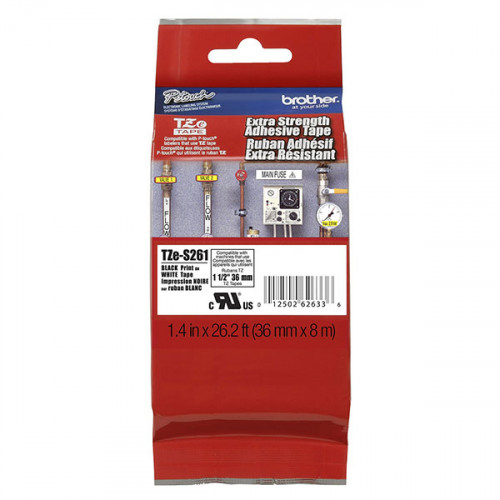 Brother 36mm (1 1/2") Black on White Extra Strength Super Adhesive Industrial Tape (8m/26.2') (1/Pkg) For use in PT-530, 550, 3600, 9200DX, 9200PC, 9400, 9500PC, 9600, 9700PC, 9800PCN Only. Brother has a full assortment of TZ tapes in various widths and sizes. Laminated colored label tape is water resistant, and stands up to grease, grime and the elements so you can have perfect colored printable labels for indoor or outdoor use.