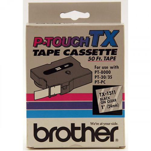 Brother 24mm (1") Black on Clear Laminated Tape (15m/50') (1/Pkg) For use in TX P-Touch: PC, 30, 35, 8000. Brother TX tapes are laminated for increased durability and perfect for everyday indoor and outsoodr home and office labeling needs.