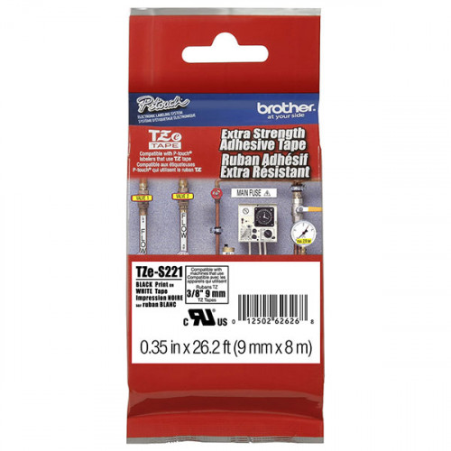 Brother 6mm (1/4") Black on White Extra Strength Super Adhesive Industrial Tape (8m/26.2') (1/Pkg) For use in TZ P-Touch: All TZ Machines. Brother has a full assortment of TZ tapes in various widths and sizes. Laminated colored label tape is water resistant, and stands up to grease, grime and the elements so you can have perfect colored printable labels for indoor or outdoor use.