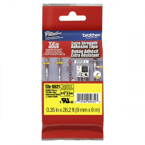 Brother 9mm (3/8") Black on Yellow Extra Strength Super Adhesive Industrial Tape (8m/26.2') (1/Pkg) For use in TZ P-Touch: All TZ Machines. Brother has a full assortment of TZ tapes in various widths and sizes. Laminated colored label tape is water resistant, and stands up to grease, grime and the elements so you can have perfect colored printable labels for indoor or outdoor use.