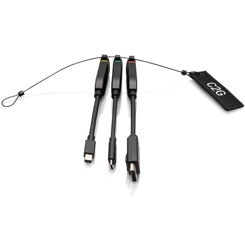 The Universal 4K HDMI Dongle Adapter Ring is the perfect addition to conference rooms, huddle spaces, lecture halls, or classrooms to make sure that anyone can connect. The standard configuration includes the adapters to connect nearly any device to the in-room display while supporting up to a 4K video resolution. This adapter ring includes HDMI to DisplayPort, Mini DisplayPort, or USB-C adapters to meet connectivity challenges. It can be awkward when connecting an adapter to a smaller laptop or tablet. The adapter may not line up correctly, causing the computer to shift or not set flat on the table. The dongle style adapter gives more flexibility, allowing for better placement when connecting to thin or lighter weight laptops. Each adapter is color-coded with a band that saves time and frustration by making it easy to identify the adapter you need quickly. Quickly grab the adapters when you need them with the integrated Pull Tab that is also available to be customized to feature your company or organization logo. Minimum order quantities apply to customized Pull Tabs. The universal cable mount attaches directly to the in-room HDMI display cable, ensuring that the adapters are always within reach. The adapter ring slides to the HDMI connector when needed and out of the way when not in use, reducing strain on the HDMI cable and clutter on the tabletop. The optional stopper fits on HDMI cables from 5mm to 10mm in diameter and prevents the adapters from sliding too far down the cable. The tools for mounting the adapters and optional stopper are in the box to simplify the installation process. The innovative HDMI Cable Gauge Tool reduces stopper installation time by allowing the right-sized stopper insert, allowing for quick identification of the HDMI cable.