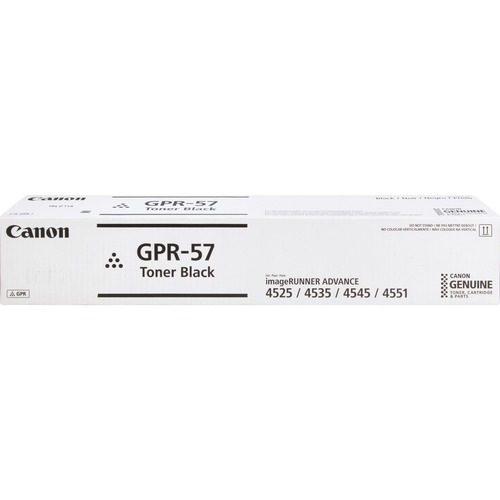 GPR-57 toner cartridge is designed for use with Canon imageRunner Advance 4525i, 4535i, 4545i and 4551i. Consistent performance meets high-quality output. Easy-to-install cartridge saves time and boosts productivity. Bottle cartridge yields approximately 42,100 pages.