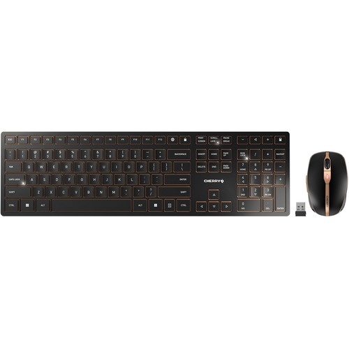Rechargeable designer desktop with many extra featuresThe CHERRY DW 9100 SLIM desktop set stands out due to its innovative functions, excellent workmanship and very flat design. You can connect the wireless mouse and keyboard with the 2.4-Ghz wireless USB receiver supplied or via Bluetooth®. You can switch connection types in an instant using a switch on the wireless mouse or keyboard. This allows e.g. a laptop to be connected via Bluetooth® 4.2 and a PC to be additionally connected via a wireless connection to be operated with the same desktop set. The data is transferred using AES-128 encryption in both cases. The range of up to 10 meters is also sufficient for e.g. multimedia applications on televisions.The CHERRY DW 9100 SLIM set features rechargeable lithium batteries that last for weeks of work. You can then conveniently charge the wireless mouse and keyboard using the USB-C cable included, even while you are working. To ensure that the rechargeable batteries are still charged after a holiday, the wireless keyboard and mouse can be switched off completely with a switch.The keyboard contains an integrated metal plate, lending it an optimal sturdiness and stability. If you prefer a steeper angle while typing, you can adjust the wireless keyboard using the removable magnetic strip. High stability is ensured by the metal plate, which prevents bending and bounding when typing.The use of high-quality scissor mechanisms with a low key stroke ensures an ideal typing experience. Status LEDs integrated directly in each key provide information on whether the CAPS LOCK, SCROLL and NUM keys are activated. In addition, these keys flash to warn that the battery charging status is low. The 6 additional keys have proved to be extremely convenient and practical: "Windows lock", "Open browser", "Quieter", "Louder", "Mute" and "Open calculator".The wireless computer mouse, which matches the keyboard perfectly in terms of appearance, also has numerous features. It fits ideally in the user''s hand thanks to its rubber-coated side parts and a compact design. The resolution can be set in three stages at the touch of a button: 1000, 1600 or 2400 dpi. A two-color status LED provides the user with information on the battery status, the charging status, the selected resolution or the connection status at all times. An extra-durable mouse wheel and a magnetic storage feature for the USB receiver are further details that ensure nothing is left to be desired. Regardless for mobile working, in the office or home office. The DW 9100 SLIM Desktop is your constant, stylish companion. The choice of Bluetooth® or wireless connection means you are flexibly equipped for all eventualities.Decisive advantages Optionally connected using Bluetooth or a 2.4 GHz wireless unit - both with AES-128 encryption. Lithium batteries can be recharged in mouse and keyboard via USB-C