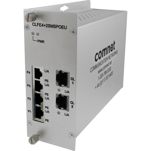 The ComNet CLFE4+2SMS[POE](C,U) is a six-port Ethernet switch with add/ drop/repeat functionality and provides 4 copper ports operating at 10/100Mbps and is designed to combine four electrical ports along with the incoming Cat5, UTP or Coax CopperLine® extension port into a further CopperLine extension port that forwards this data to the next CopperLine network device. There is no programming required to use this product. The ComNet CLFE4+2SMS(C,U) comes pre-programmed, preventing network video flooding with DIP switch selection of the first CopperLine port as an uplink or as an unmanaged switch. Ports 1-4 of the CLFE4+2SMSPOE(C,U) can supply up to thirty (30) watts of Power over Ethernet (PoE) and incorporate PoE+ features based on the IEEE 802.3at standard. Features Full 10/100 Mbps Bandwidth 10/100 Mbps Ethernet 4 ÃÃÂÃÂ 10/100Mbps RJ-45 Ports 2 ÃÃÂÃÂ 10/100Mbps UTP/Coax Extended Distance Ports IEEE 802.3 compliant Extended distance ports are switch-selectable for 10 Mbps or 100 Mbps data rate, 1 pair or 4 pair in UTP mode IEEE802.3at PoE+ 30W (PoE models only) Supports Multicast, Unicast Extended distance over UTP or Coaxial Cable Plug-and-play design ensures ease of installation and no electrical or optical adjustments are ever required. Voltage transient protection on all power and signal input/output lines provides protection from power surges and other voltage transient events. ComFit standard form factor is interchangeable between stand-alone or rack mount use. Designed to meet full compliance with the environmental requirements (ambient operating temperature, mechanical shock, vibration, humidity with condensation, high-line/low-line voltage conditions, and transient voltage protection) of NEMA TS-1/TS-2 and the Caltrans Specification for Traffic Signal Control Equipment. Electric Port Supports Auto-negotiation for Full Duplex or Half Duplex Data Throughput Standard ComFit models are hot-swappable. Applications 10/100 Mbps Ethernet High Speed Computer Links Drop/Insert/Repeat Ethernet data over extended distances Factory Automation with UTP