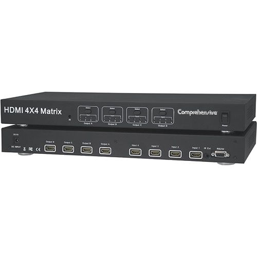 The CSW-HD440 HDMI matrix switcher routes high definition video in multiple resolutions up to 1080p plus multichannel digital audio from any of the four HDMI sources to the displays. Four outputs give you the choices of sending high definition audio and video signals up to four displays. Any four to any four matrix switching allows for maximum versatility for integrated systems. The CSW-HD440 eliminates the need to disconnect and reconnect sources to a display equipped with one input. It works with Blu-ray DVD players, TiVo systems, HT PCs, and satellite set top boxes that connect to an HDMI display. Every source is accessible at all times by any display by selecting it with an IR remote or through the RS-232 port. Always use Comprehensive brand premium cables to ensure maximum performance!
