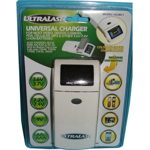 Ultralast Universal Li-Ion / Ni-Cd / Ni-Mh Battery Charger - 1 Hour Charging - 12 V DC, 120 V AC, 230 V AC Input - 5 V DC Output - Input connectors: USB - AC Plug - 2