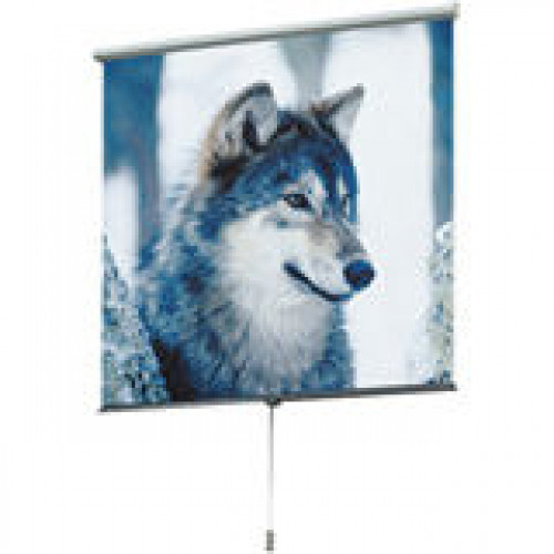 Luma wall/ceiling projection screen. For small to medium sized groups. Spring-roller operated. Housed in pentagonal steel case with a scratch-resistant white polyester finish and matching endcaps. Endcaps form universal hanging brackets for attachment to wall or ceiling.