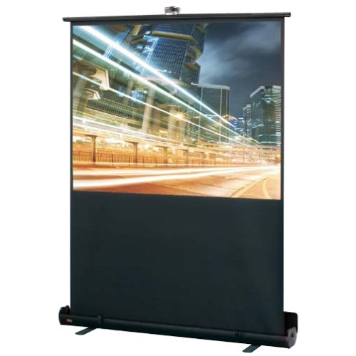 Traveller portable projection screen. Self-contained in an extruded aluminum case. Easy to carry. Durable. Built-in carrying handle. Shoulder carrying strap also included. Telescoping support twist locks to position screen at desired height. Clean, simplified design.