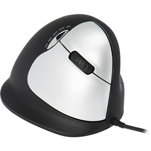 R-GO HE BREAK MOUSE, ERGONOMIC MOUSE, ANTI-RSI SOFTWARE, LARGE (ABOVE 185MM), RIGHT HANDED, WIRED R-Go HE Mouse with break software The R-Go HE Mouse Break is an ergonomic vertical mouse that ensures a natural, relaxed position of your arm and hand and uses colour signals to indicate whether you are taking enough breaks. The LED colour signals indicate whether you are working in a healthy way; in other words, whether you are taking enough breaks. Green means ''good'', orange means you should take a break, and red means you skipped a break or have exceeded your total daily mouse time. Using the so-called ''traffic light colours'', you receive feedback about your healthy (break) behaviour in a simple and positive way. The mouse will encourage you to take breaks on a regular basis. These vital interruptions help prevent overburdened muscles and tendons in the arm and hand, stimulate blood flow in the body, and help you (often unconsciously) change your behaviour in a simple way. Gives advice Gives break advice whilst working by the use of colour signals (LED on the thumb side of the mouse). Movement stimulation Stimulates the mouse movement from the arm instead of the wrist so that overload of small muscles and tendons can be prevented. Ergonomic vertical shape Has an ergonomic vertical shape that ensures a natural and relaxed state for the arm and hand.