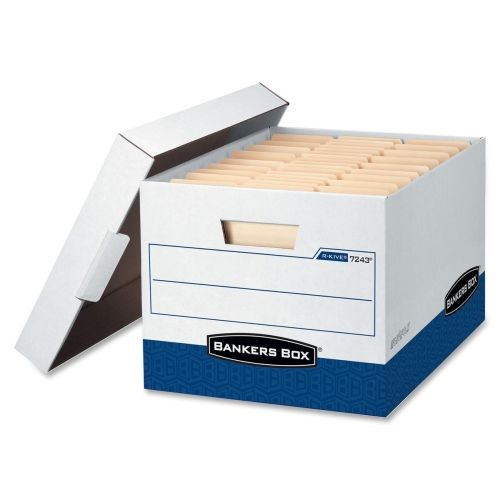 Stackable, storage box is strong, dependable, portable and stackable. Heavy-duty, triple-end, double-side, double-bottom construction stacks up stronger and withstands frequent handling. Stacking weight is 850 lb. Reinforced tear-resistant hand holes make box comfortable to carry. Deep, locking liftoff lid stays in place for secure file storage for letter-size or legal-size files. Smooth rolled edges add strength and prevent paper cuts. Easy FastFold One Step Setup saves assembly time. Box is built for heavy daily usage and maximum stackability. Ideal for stacking without shelving. Storage box contains a high percentage of recycled material. More from the Manufacturer