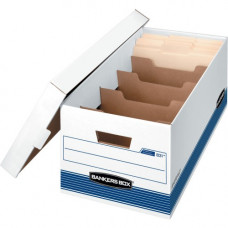 Dividers prevent files from falling over. FastFold® quick and easy assembly. Five, 5" dividers keep files upright even when box is partially full. Medium-duty, double end, 1-1/2 side, double bottom construction for use with or without shelving. Deep, locking lift-off lid stays in place for secure file storage. Smooth rolled edges add strength and prevent paper cuts.