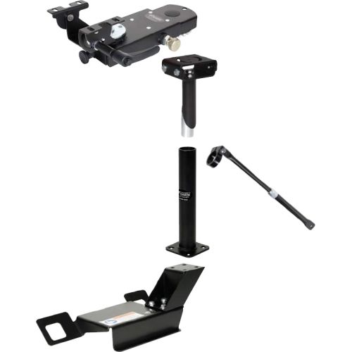 Solution Components:1. Vehicle Base (Item No. 7160-0046) Vehicle Base is a no-drill solution and attaches to the passenger side seat studs. Designed using heavy gauge steel for long-term durability.2. Lower Tube (Item No. DS-LOWER-9) The Lower Tube provides vertical clearance over the center console or the seat.3. Upper Pole (Item No. 7160-0177)Center Upper Pole allows for closer mounting to the dash and less stress on the vehicle mounting equipment as gravity is centered on the pole. Wrench is needed for loosening, tightening or height adjustment.4. 9" Locking Slide Arm - Mongoose (Item No. 7160-0220) Locking Slide Arm can rotate around 360° with locking points every 15°. Slide Arm can extend out from 9" to 13" from center pole and locks automatically in the retracted 9" position. Motion Attachment has tilt capabilities up to 90° forward/30° backward and can be swiveled up to 360°.5. Support Brace (Item No. 7160-0230) Support Brace provides additional mount system support in rugged driving conditions and increases mounting system rigidity.