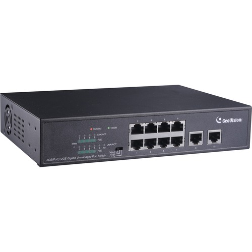 GV-APOE0810 is a 10-port 10/100/1000 Mbps unmanaged PoE Switch with 8 PSE/PoE ports and 2 uplink ports. The switch supports IEEE 802.3at Power over Ethernet standard, up to 32 W per port, for up to 8 GV-IP devices and a maximum power consumption of 125 W. In addition to not requiring special network cables for connecting your powered devices (PD), such as IP cameras, it also allows power supply over cables of up to 250 m (820 ft) in length, at 10 Mbps. The switch is designed for small or medium network environment to strengthen its network connection and efficiency. It also gives you the option of VLAN mode to isolate each of the PoE ports for an enhanced forwarding rate of time.