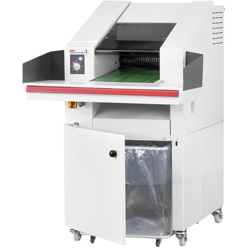 High quality materials and "Made in Germany" quality for safety and durability. Cutting rollers made of hardened solid steel. Convenient material feeding via conveyor belt. Powerful motor allows for continuous operation. An automatic return eliminates paper jams. User safety through emergency off switch. Automatic oiler provides for consistently high cutting capacity. Multifunction element for intuitive operation. Mobile on castors.