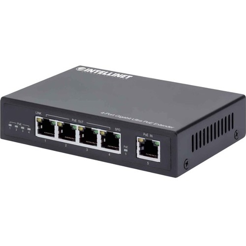 The Gigabit PoE Extender - for doubling the range of a Gigabit Power over Ethernet connection The Intellinet Network Solutions 4-Port Gigabit Ultra PoE Extender adds up to 100 m (328 ft.) to the connection distance from a PoE source to four output devices via Cat5e or Cat6 cable. This PoE extender does not need an additional power supply since it draws its power from the PoE input. Reduced Wiring Costs This Ultra PoE Extender helps avoid the expense of running AC power lines for a wireless access point, network camera or IP phone. Simply connect the PoE Extender to the LAN switch port through existing Cat5e/6/6a cables to deliver DC power as well as transfer data. Power over Ethernet 802.3bt Compliant The Intellinet Network Solutions 4-Port Gigabit Ultra PoE Extender supports the IEEE 802.3bt protocol over four pairs (4PPoE), which allows for a power input of 90 W. It forwards data at Gigabit speeds and offers up to 30 watts per port to a connected IEEE 802.3at- or IEEE 802.3af-compliant device. The cable length on both ends can be up to 100 meters (328 ft.), bringing the total distance between PoE source and device to 200 m (656 ft.). Simple Installation This PoE Extender was designed to be as easy as possible to set up and use. All it takes to have it up and running is to connect its "PoE In" port to your PoE injector or PoE switch and to connect the "PoE Out" ports to the PoE devices you want to connect (e.g., a VoIP phone and a PoE network camera). Doubles the maximum connection distance between PoE source and device from 100 m (328 ft.) to 200 m (656 ft.) Connects and powers four PoE devices such as network cameras, wireless access points or VoIP phones, from one PoE injector or PoE switch PSE port Delivers up to 90 W to four connected PoE devices with up to 30 W per port Supports 10/100/1000 Mbps data rates Total PoE power budget of 90 watts Saves time and money by delivering data and power via existing network cables PoE awareness, ensuring that power is only sent to IEEE 802.3at/af-compliant devices; non-PoE devices only receive data Short-circuit, overload and high-voltage protection Grounding point to protect equipment from external electrical surges Requires no additional power supply; draws power directly from the PoE input Compatible with IEEE 802.3bt/at/af-compliant PoE injectors and PoE switches (PSE) Compatible with IEEE 802.3at/af-compliant powered devices (PD) Functional as a PoE-powered 5-Port Gigabit Switch with PoE Passthrough Switch fabric of 10 Gbps Supports jumbo frames up to 9 kBytes Supports 2048 MAC address entries LEDs for PoE and data Fanless design ideal for silent operation Compact metal case Three-year warranty