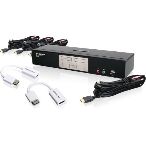 4-Port HDMI / DisplayPort KVM Switch Switch between four computers with the push of a button Offers the flexibility to mix and match computer connections: HDMI and DisplayPort Includes 2 x DisplayPort to HDMI adapters Switching via pushbutton, hotkey, or OSD Cost effective, Plug-N-Play solution HD and DisplayPort Mix & Match Solution IOGEAR''s HD and DisplayPort KVM Solution enables effortless control over 4 HDMI or DisplayPort computers using a single USB keyboard, USB mouse and single high definition display (720P or 1080P) or HDTV. This bundle is perfect for a home office or small / medium size business, as it offers the flexibility of choosing between HD and/or DisplayPort connections. Take advantage of your existing computers, and use the included DisplayPort adapters to display content from your DisplayPort enabled devices on a large external HDMI display or HDMI projector. HD Technology Connect your high definition display with HDMI connections, HDTV (flat panel, plasma, DLP, digital TV) and data projectors. The 4-Port HD KVMP Switch is HDCP compliant and equipped with IOGEAR''s DynaSync. This feature reads and remembers the monitor''s parameters (EDID), eliminating any delays or change in video resolution when switching between, or booting computers. IOGEAR''s advanced HDMI KVMP can increase efficiency and save equipment cost for applications where HD resolutions, large or widescreen monitors with HDMI connections are used and required: Desktop Publishing / Graphic Design / Video Editing Digital Home Entertainment High-End Gaming, where high video resolution (1080p HD) is demanded Expanded Connectivity IOGEAR''s Mini DisplayPort to HDMI adapter supports the DisplayPort 1.1a standard, giving you the ability to send high resolution video up to 1920x1200 to your external HDMI display or projector. The 4-Port HDMI KVM Switch features two USB 2.0 peripheral ports for asynchronously sharing USB devices between your computers. The patented asynchronous switching allows the user to independently switch applications between the connected computers. You can run one application on one computer while running another application on the other. A powered USB hub may be attached to the peripheral ports for added functionality. This HD - DisplayPort KVM bundle offers a simple Plug-N-Play out-of-box solution; including all cabling required for "Set-up and Go"! IOGEAR''s Mini DisplayPort to HDMI adapter supports audio pass through, eliminating the need for additional cabling to get audio signals from your Mini DisplayPort device to your HDTV or projector.