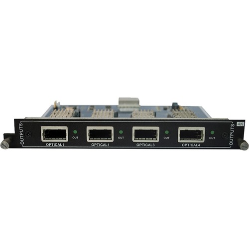 The KanexPro MOD-OUT-FIBER is a 4-Output fiber optic card designed to connect four remote displays to the HDMMX Modular matrix switchers. It supports resolutions ranging from 1920x1200, 1080p to 4Kx2K. This HDCP compliant, fiber output card is compatible with single-mode and multi-mode extending to greater distances. Applications: Fiber optic switchers are used where security is paramount ideally in government, defense, command and control centers, banks and other large scale AV applications where routing of 4K AV transmission at remote distances is critical and safe.