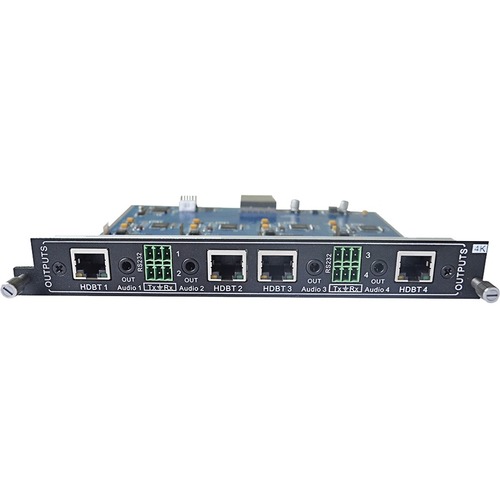 The KanexPro MOD-OUT-CAT6-4K is a 4K compliant, 4-output card designed to work with the HDMMX Modular matrix switchers. The twisted pair card extends each output to up to 230 feet (70m) to remote displays producing 4K UHD resolutions. It''s a high-bandwidth card that supports 4Kx2K, 1080p, and 1920x1200@60Hz with the latest EDID and HDCP compliance. The bi-directional RS232 connections for each output allow control signals at the equipment rack to control displays connected when used with the HDBASE70POER Receiver. Applications: Ideally designed to work with the extension of long HDMI runs over cost-effective CAT5e/6 cable to remotely control source and destination devices.Features 4-Output HDBaseT card for MMX modular matrix switchers Provisions 4K UHD resolutions Supported resolutions: 4Kx2K, 1920x1200, 1080p & 3D Extend up to 230 feet (70m) over single CAT6 Shielded Twisted Pair High bandwidth up to 10.2 Gbps Built-in audio de-embedder Built-in EDID management Supports DVI/ HDMI signals Bi-directional RS-232 control Supports HDBaseT Specifications; HDMI and HDCP compliance Can be used with HDBASE70POER Receiver Extender