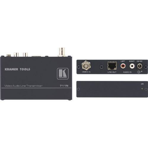 The 711N is a twisted pair transmitter for composite video and unbalanced stereo audio signals. The 711N transmitter converts composite video and stereo audio to a twisted pair signal and the 712N receiver converts the twisted pair signal back into composite video and stereo audio signals.