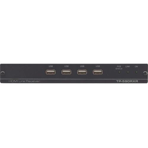 TP-590RXR is a high-performance, extended-reach HDBaseT 2.0 receiver for 4K60Hz (4:2:0) HDMI, USB, Ethernet, RS-232, IR and stereo audio signals over twisted pair. It extends video signals to up to 100m (330ft) over CAT copper cables at up to 4K@60Hz (4:2:0) 24bpp video resolution and provides even further reach for lower HD video resolutions. High Performance Standard Extender - Professional HDBaseT extender for providing extended-reach signals over twisted-pair copper infrastructures. TP-590RXR is a standard extender that can be connected to any market-available HDBaseT-compliant extension product. For optimum extension reach and performance, use recommended Kramer cables. HDMI Signal Extension - HDMI 2.0 and HDCP 1.4 compliant. Supports deep color, x.v.Color™, lip sync, HDMI uncompressed audio channels, Dolby TrueHD, DTS-HD, 2K, 4K, and 3D. EDID and CEC signals are passed through from the source to the display. I-EDIDPro™ Kramer Intelligent EDID Processing™ - Intelligent EDID handling, processing and pass-through algorithm ensures Plug and Play operation for HDMI source and display systems. Multi-channel HDMI Audio Extension - Up to 32 channels of digital stereo uncompressed signals for supporting studio-grade surround sound. Audio De-embedding (Drop-and-Continue) - The transmitted digital audio signal is extracted from the AV signal (dropped), converted to an analog signal for transmission to stereo balanced analog audio output, in parallel to being transmitted (continued) to the HDMI AV output. This enables high-quality audio playback by routing the audio to external speakers in parallel to routing the audio to the connected AV acceptor device''s local speakers (such as TVs with speakers). USB Extension - USB 2.0 interface data flows in both directions, allowing extension of HID (Human Interface Devices) peripheral devices, such as a mouse or a keyboard. High-bandwidth USB peripheral devices, such as USB isochronous streaming cameras and audio devices, transfer data continuously and periodically. Delivery of their transferred data is not guaranteed by the USB standard and is subject to both USB and HDBaseT line bandwidth management limitations. When such devices are connected, check their functionality to ensure bandwidth limitations are not exceeded. Ethernet Extension - Ethernet interface data flows in both directions, allowing extension of up to 100Mbps Ethernet connectivity for LAN communication and device control. Bidirectional RS-232 Extension - Serial interface data flows in both directions, allowing data transmission and device control. Bidirectional Infrared Transmission - IR interface data flows in both directions, allowing remote control of peripheral devices located at either end of the extended line. Cost-effective Maintenance - Status LED indicators for HDMI and HDBT ports facilitate easy local maintenance and troubleshooting. Remote device management via built-in web UI, RS-232 connection and Kramer Network. Local and remote firmware upgrade via mini-USB, RS-232 or Ethernet connection and the K-Upload tool ensure lasting, field-proven deployment. Easy and Elegant Installation - Single cable connectivity for both HDBaseT signals and power. Compact MegaTOOLS™ fan-less enclosure for dropped-ceiling mounting, or side-by-side mounting of 2 units in a 1U rack space with the optional RK-T2B rack adapter.