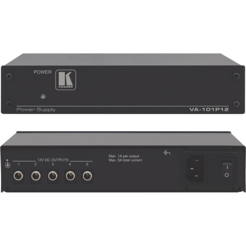 The VA-101P12 is a 5-output power supply that powers 12V DC powered devices. The VA-101P12 can supply a maximum of 1A of current to each of five devices for a total of 5A. The power supply is especially useful in high-population installations for saving space and eliminating a large number of 12V DC power adapters.