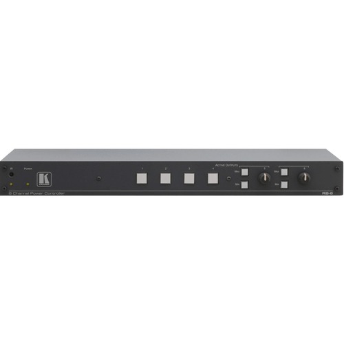 The RB-6 is a high-performance power supply that distributes power to up to six external units. Four power outlets have on/off push-button control and two power outlets have on/off switching as well as full voltage control. Active Output Control - All outputs On/Off control, 5 & 6 min/max with full voltage variability via rotary knobs. Power Output - 10A total, maximum 6A per output. Embedded Web Server Control - Turns On & Off all channels and adjusts voltage on 5 & 6, schedules outlet activity of each channel separately via Ethernet. Expandable - Cascades up to 8 units. Varied Control Options - Front panel buttons, IR remote control, RS-232, RS-485 & Ethernet. Indicators - Push button LEDs show active output, power and IR status LEDS. Worldwide Power Supply - 100-240V AC, US and EU models available. Standard 19" Rack Mount Size - 1U. Rack "ears" included. APPLICATIONS Production studios. Large multimedia displays. Home entertainment installations.