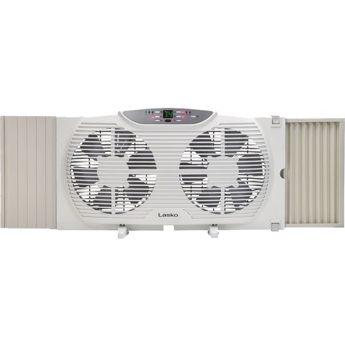 This fully-equipped twin window fan from Lasko features 9" electrically reversible fans with independently controlled motors. Operate fans with 2 on intake, 2 on exhaust, or one on each setting. Fits most windows. Digital display, thermostat, timer and remote control.
