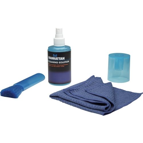 Helps keep surfaces clean to restore brightness and clarity. The Manhattan LCD Cleaning Kit gently cleans and removes dirt, fingerprints and smudges from most LCD surfaces, making it ideal for use with flat panel displays, televisions, notebook computers and other electronics. A soft, synthetic brush gently eliminates excess dust and debris without scratching. The bristles retract into the handle to keep them clean and protected. The non-aerosol cleaning solution safely and thoroughly removes fingerprints and smudges without harsh solvents or abrasives. A soft, lint-free microfiber cloth gently cleans, dries and polishes for a clear, non-streak finish. Safe and Alcohol-Free For best results, spray cleaner onto microfiber cloth, gently wipe then quickly dry any excess liquid from LCD surface. Safe for frequent use on LCD surfaces to help restore and maintain brightness and clarity. Manhattan does not recommend that cleaning solution be directly applied to any LCD surface. Not recommended for use on anti-glare, privacy or polarized materials.