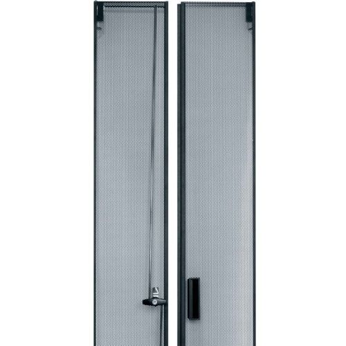 Add a vented or split rear door in selected sizes. Black textured powder coat finish. See price list for racks available less rear door (LRD). Fully vented rear doors have 64% open area. Split rear doors with 3 point latch offer 79% open area and require less floor space when accessing rear equipment connections.