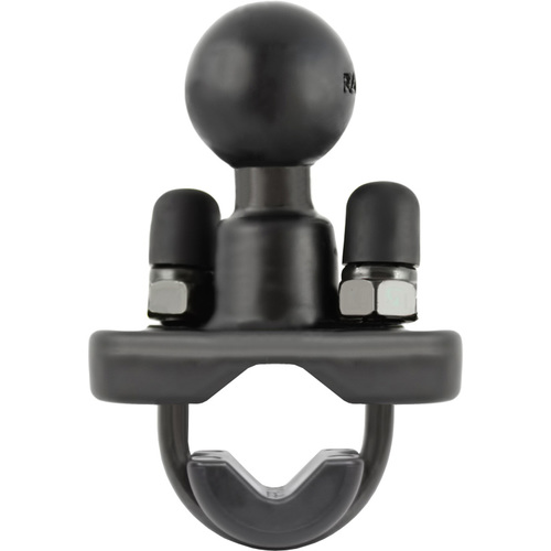 The RAM motorcycle handlebar base contains a 1" rubber ball designed to sit at right angles to the mounting rail. The rust proof metal u-bolt accommodates rails in diameter from 0.5" to 1" in diameter. Included are black cover caps to be placed over the exposed ends of the u-bolt and a composite adapter that can narrow the rail to a minimum width of 0.5".