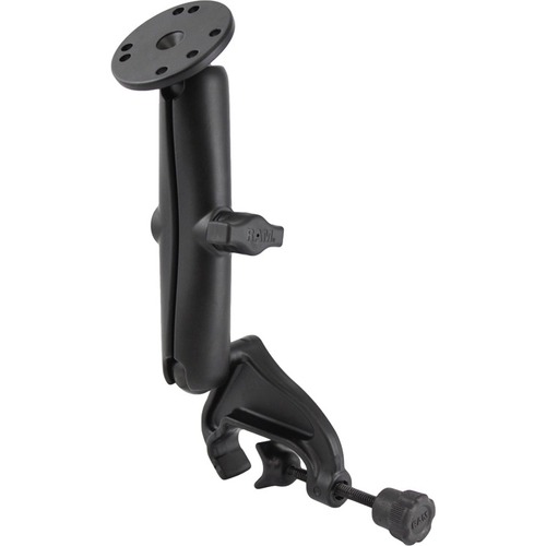 The RAM-B-121U-C consists of a yoke clamp base, LONG length double socket arm and round 2.5" base that contains the universal AMPs hole pattern. The yoke clamp base will fit rails in diameter from 0.625" to a maximum of 1.25". The 1" rubber ball is at a right angle to the plane of the mount; when connected to a rail, the ball sits parallel to the rail. The mount is designed with a RAM 1" diameter patented rubber ball and socket system that has adjustment points at both ends of the double socket arm, allowing for almost infinite adjustment and perfect viewing angles.