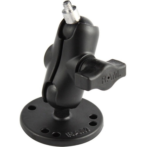 The RAM-B-101-A-237U consists of a short double socket arm, 2.5" diameter round base and 1" diameter rubber ball, connected to a 1/4"-20 camera thread. The male thread matches most standard camera and camcorder female threads found on the bottom of the camera. The round base contains pre-drilled holes, including the universal AMPs hole pattern. Designed into the mount is a 1" diameter patented rubber ball and socket system with adjustment points at both ends of the socket arm; this with a twist of the arm knob, allows for infinite articulation and optimum viewing angles.