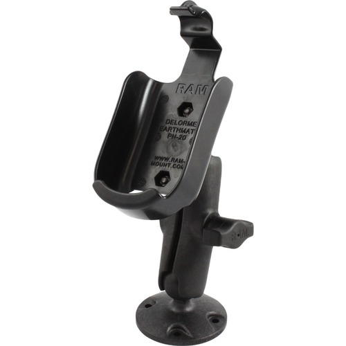 The RAP-B-138-DEL1 consists of a double socket arm, 2.5" diameter round base with the universal AMPs hole pattern, diamond adapter base and custom high strength composite cradle for the Delorme Earthmate. Designed into the mount is a 1" diameter patented rubber ball and socket system with adjustment points at the base and cradle. With a twist of the arm knob, you can move the flat surface Delorme Earthmate mount to your optimum viewing position.