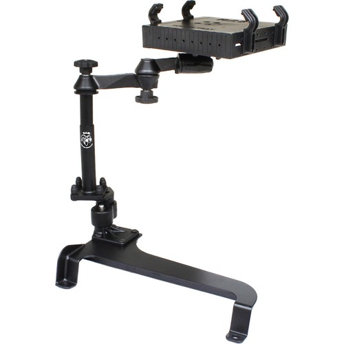 This No-Drill™ Laptop Stand System installs quickly and easily into the specified vehicles using the existing hardware of the passenger side seat rails. This configuration provides a telescoping feature that ranges from 12 to 18 inches. Dual swing arms provide articulation and 12 inches of reach for passenger and driver access to the mounted device. Patented rubber ball and socket joint provides additional adjustment as well as shock and vibration isolation. The RAM Tough-Tray™ is spring loaded to accommodate 10" to 16" wide laptops & (17" wide screens). The tray features four adjustable retaining arms with rubber grip feature. These arms can be moved both vertically and horizontally. This allows for a custom fit for varying thicknesses of laptops and the freedom of not blocking ports or drives. A screen support and USB light are also available to accessorize the tray. Hole patterns on perimeter of tray facilitate the mounting of additional RAM systems to support GPS or other electronics.