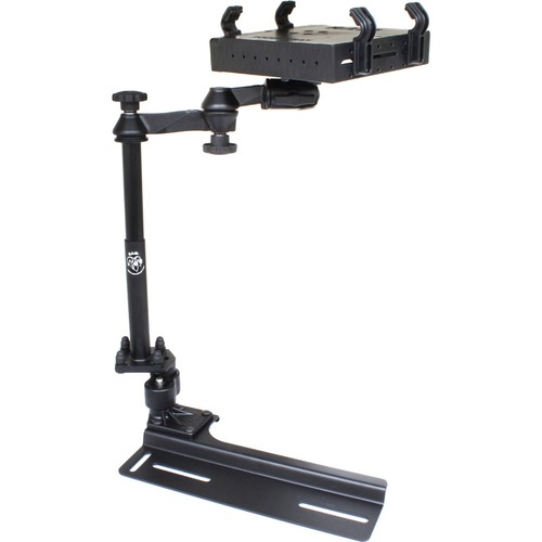 This No-Drill™ Laptop Stand System installs quickly and easily into the specified vehicles using the existing hardware of the passenger side seat rails. This configuration provides a telescoping feature that ranges from 12 to 18 inches. Dual swing arms provide articulation and 12 inches of reach for passenger and driver access to the mounted device. Patented rubber ball and socket joint provides additional adjustment as well as shock and vibration isolation. The RAM Tough-Tray™ is spring loaded to accommodate 10" to 16" wide laptops & (17" wide screens). The tray features four adjustable retaining arms with rubber grip feature. These arms can be moved both vertically and horizontally. This allows for a custom fit for varying thicknesses of laptops and the freedom of not blocking ports or drives. A screen support and USB light are also available to accessorize the tray. Hole patterns on perimeter of tray facilitate the mounting of additional RAM systems to support GPS or other electronics.
