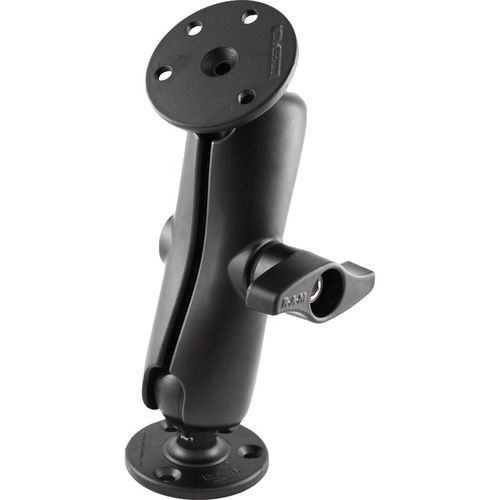 The RAM-D-101-MIU consists of (2qty) 3.68" diameter round bases and STANDARD length double socket arm with jam nut. The 3.68" diameter round bases have pre-drilled holes, including two holes at 180 degrees and three holes at 120 degrees. Designed into the mount is a 2.25" diameter patented rubber ball and socket system with adjustment points at both socket ends of the arm. Rubber ball and socket technology allows for almost infinite adjustment and perfect viewing angles.