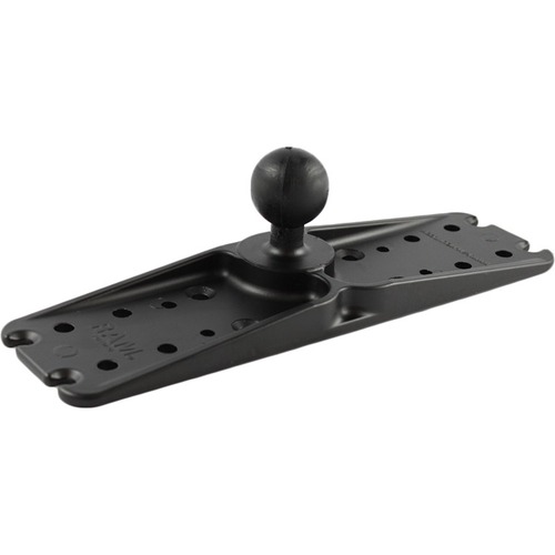 The RAM-137BU, universal mounting plate, consists of a 1.5" diameter rubber ball, connected at right angles to a flat 3" x 11" rectangular plate. The plate contains different combinations of pre-drilled holes which will match up to many electronic devices and mounts, including Marine GPS, CB Radios, Ham Radios, Gimbal Brackets and more.