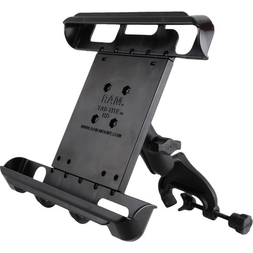 The RAM-B-121-TAB8 consists of a yoke clamp base, double socket arm, round base adapter and Tab-Tite™ universal clamping cradle. The mount is designed with a RAM 1" diameter patented rubber ball and socket system that has adjustment points at both ends of the double socket arm; this allowing for almost infinite adjustment and perfect viewing angles. The included Tab-Tite™ cradle includes a spring loaded back plate and custom support cups for 10" screen tablets WITH heavy duty cases. The spring loaded design makes it easy to load and unload your tablet, along with keeping it secure while on the go. Interchangeable cup ends are designed to optimize the functionality of your tablet, allowing access to audio jacks, usb, power, and other ports, your tablet can be used just as it was intended. The Tab-Tite™ cradle is compatible with any tablet that will fit the dimensions listed below. It is important to verify the dimensions of your tablet when determining the overall size.