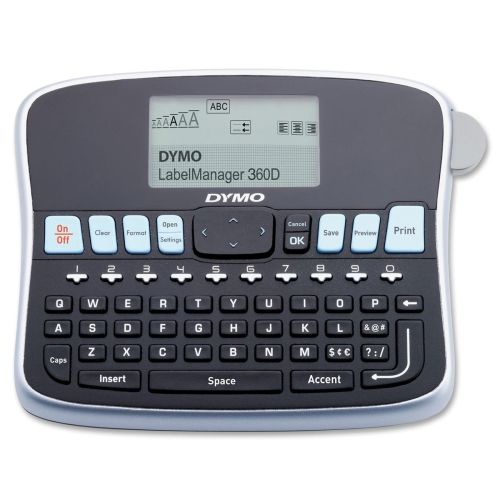 Labelmaker offers a large 1-1/2" x 2-3/4" screen with two lines of label text. Graphical display lets you see text effects on screen before you print. Print up to 10 copies of the same label. User interface displays all menu items without scrolling and includes intuitive icons for formatting options. Familiar QWERTY keyboard speeds text entry. Label printer offers a nine-label memory, save-text feature and quick access to special symbols including punctuation and currency. Customize labels and add emphasis by choosing from three font styles, seven font sizes, one of the many styles, and one of eight different box styles or underline. Label printer uses Dymo D1 labels in 1/4", 3/8", 1/2" and 3/4" widths. Compact, lightweight design is perfect for any office or work space. Label maker is powered by a rechargeable lithium-ion battery and includes a lithium-ion battery, charging cord, starter label cassette and manual. More from the Manufacturer